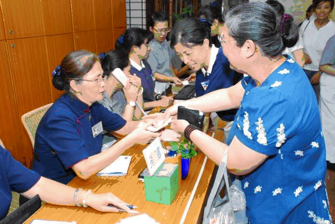 圖左:葉致美師姊捧著流動愛心箱,來賓會眾發揮愛心踴躍捐款,援助八八水災。