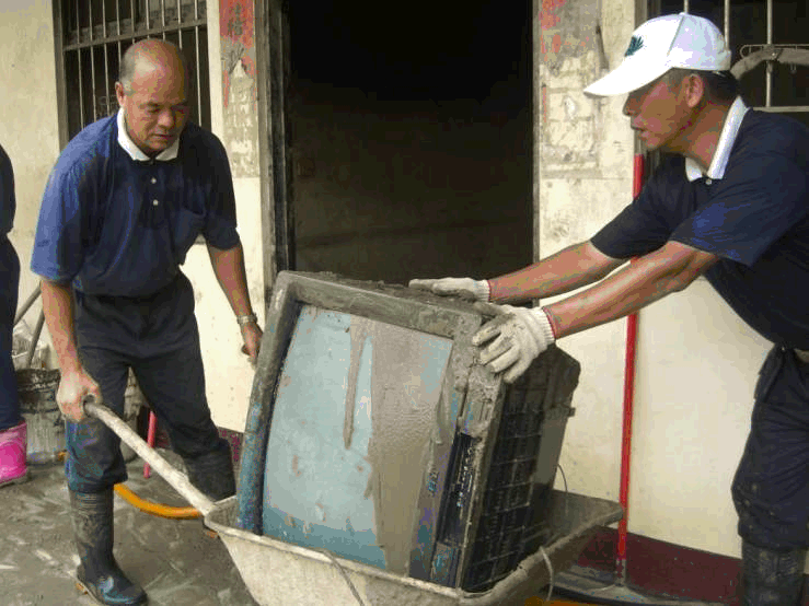圖右:因陳仁彥師兄〈左〉的地緣關係,香港志工到高雄甲仙鄉災區幫忙清掃家園。