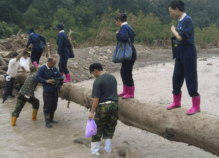 圖右:橋斷路毀,志工只好小心翼翼的走飄流木過河。